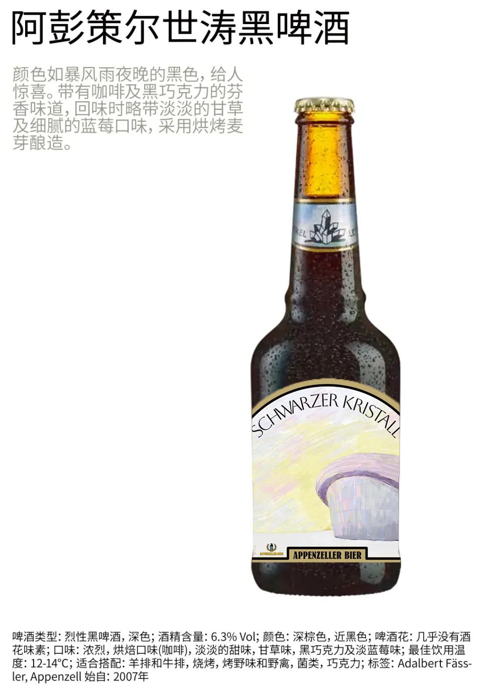 阿彭策尔世涛黑啤曾连续斩获2021年的瑞士最佳啤酒、2022世界啤酒大赛银奖、2022瑞士啤酒大赛金奖及2022迈宁格国际精酿啤酒大赛金奖。