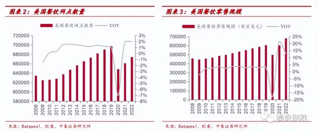 从餐饮零售额看,2020年从6044亿美元下降至4968亿美元,同比下降17.8%;但2021年随着管控放开,同比增长21.4%,强势恢复到接近疫情前水平;2022年餐饮市场规模继续增长12.8%达到6802亿美元。
