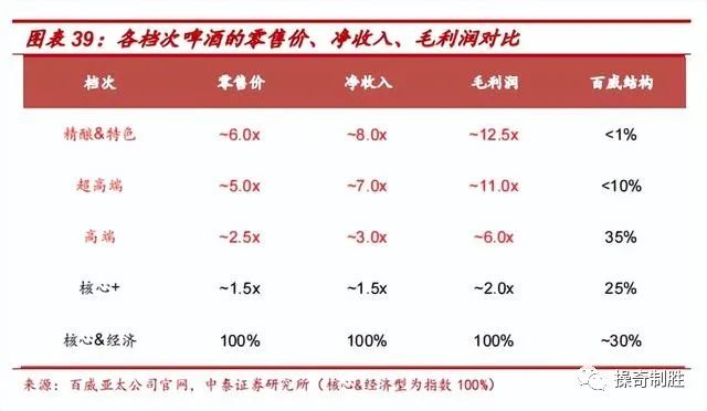 高端主要包括百威家族产品,以夜场、中高端餐饮为主要渠道,零售价和净收入为基准的2.5倍和3倍,毛利润为基准的6倍。