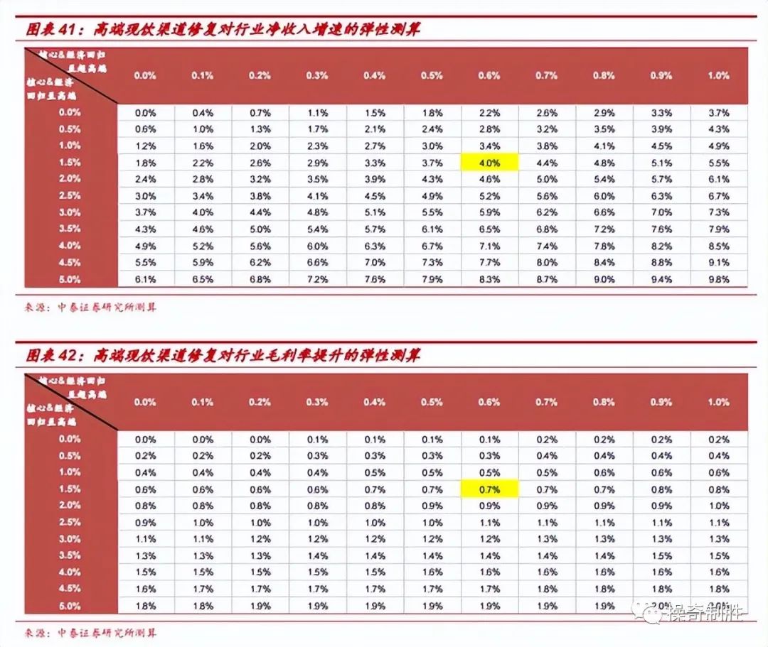 基于前述假设,我们测算出,随着高端现饮渠道修复,如果有1.0%的行业销量从核心&经济回归至超高端,有5.0%的行业销量从核心&经济回归至高端,则可以带动行业均价增长9.8%,毛利率提升2.0个pct。