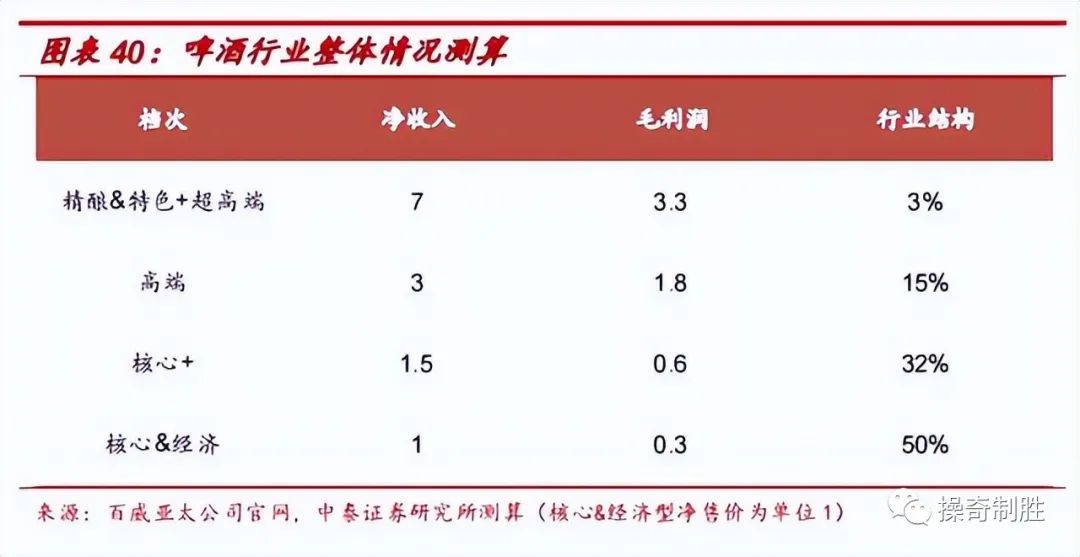 因此最终我们测算部分销量从核心&经济档回归至高端、超高端、精酿&特色档能带来的净收入和毛利率的贡献。由于超高端和精酿&特色档的净收入及毛利润接近,我们合并计算,以超高端的数值为准。