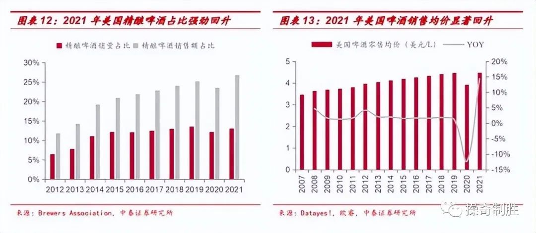 从美国啤酒零售均价看,2020年同比下降12.3%,而2021年受益于现饮修复带来的结构优化,均价同比大幅增长14.4%。