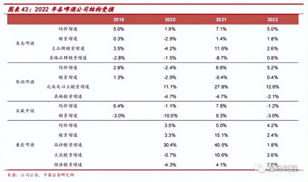2022年由于高端现饮渠道承压,各家啤酒企业结构均受损,受损严重程度排序依次为百威中国、重庆啤酒、青岛啤酒、华润啤酒。