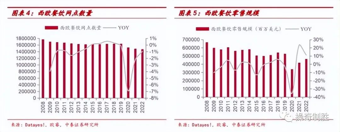 西欧各个国家放开时间不一,因此复苏节奏慢于美国。从餐饮网点数量看,2020由于疫情从163.8万个下降至152.5万个,同比下降6.9%;此后2021-2022年每年仍下降2.2%和1.0%。
