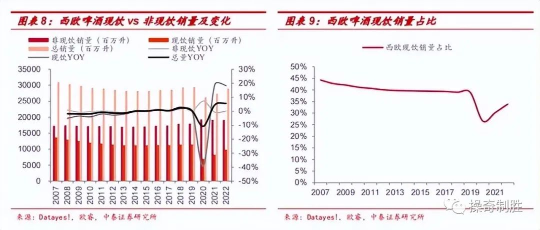 2020年西欧现饮渠道啤酒销量下降39.1%,非现饮销量上升7.3%,总销量下降10.8%,现饮占比从38.9%下降至26.6%;2021-2022年西欧现饮销量分别增长18.8%和18.2%,恢复到疫情前销量的86%,现饮占比回升到33.9%,对比疫情前仍有进一步恢复的空间。