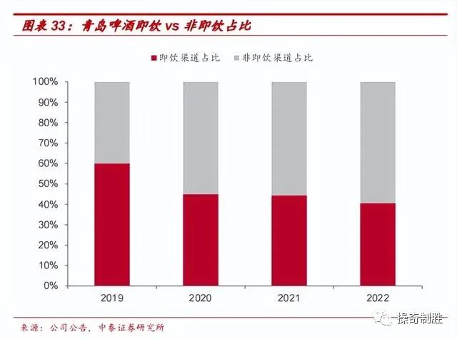 2019年疫情之前,青岛啤酒的渠道结构中,即饮渠道占比超过60%,主要包括餐饮、夜场等渠道;非即饮占比不到40%,主要包括商超、传统流通、电商等。