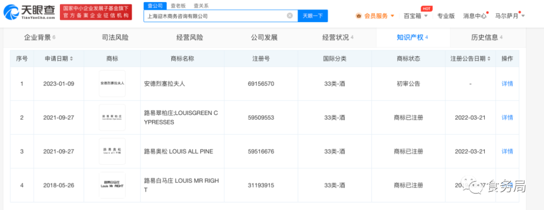 知识产权信息显示,上海迎木商务咨询有限公司申请注册了路易白马庄商标,该品牌曾推出某款红酒宣称“朱一龙联合宣发”“朱一龙推荐”。另据公开信息显示,烟台宾富酒园葡萄酒有限公司系该款红酒生产商。