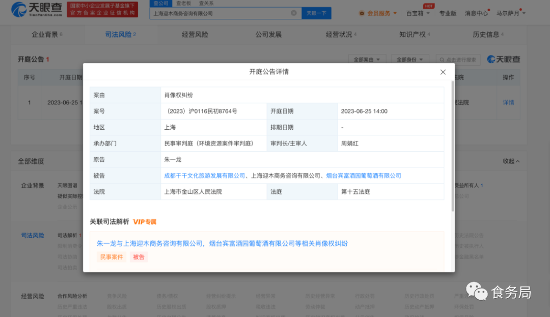近日,上海迎木商务咨询有限公司、烟台宾富酒园葡萄酒有限公司、成都千千文化旅游发展有限公司新增一则开庭公告信息,原告为朱一龙,案由为肖像权纠纷,该案将于6月25日在上海市金山区人民法院开庭审理。