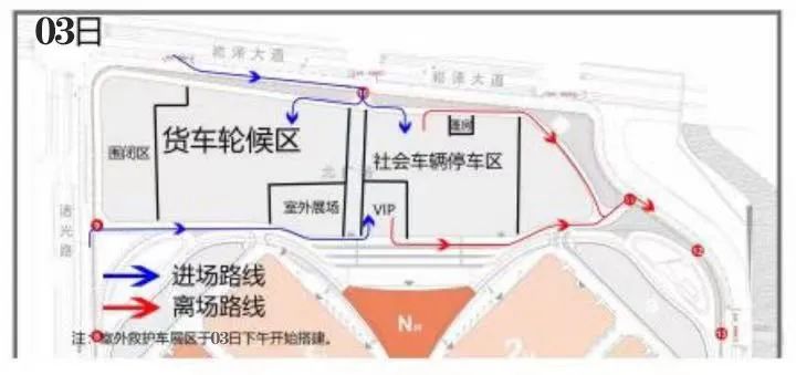 布、撤展期红线内外货车泊位共计 1200 个,其中场外 P9停车场(寅中寅)货车泊位约 600 个;P10 停车场有 300 个货车泊位,场内北广场货车泊位约 300 个。全馆货车限高 4.5 米,限长 17.5 米(含车头)。