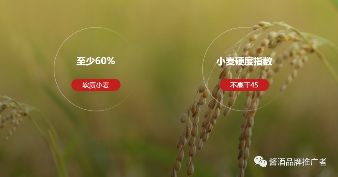 酱香型白酒酿造选用优质小麦制作酒曲,至少60%的软质小麦,小麦硬度指数不高于45