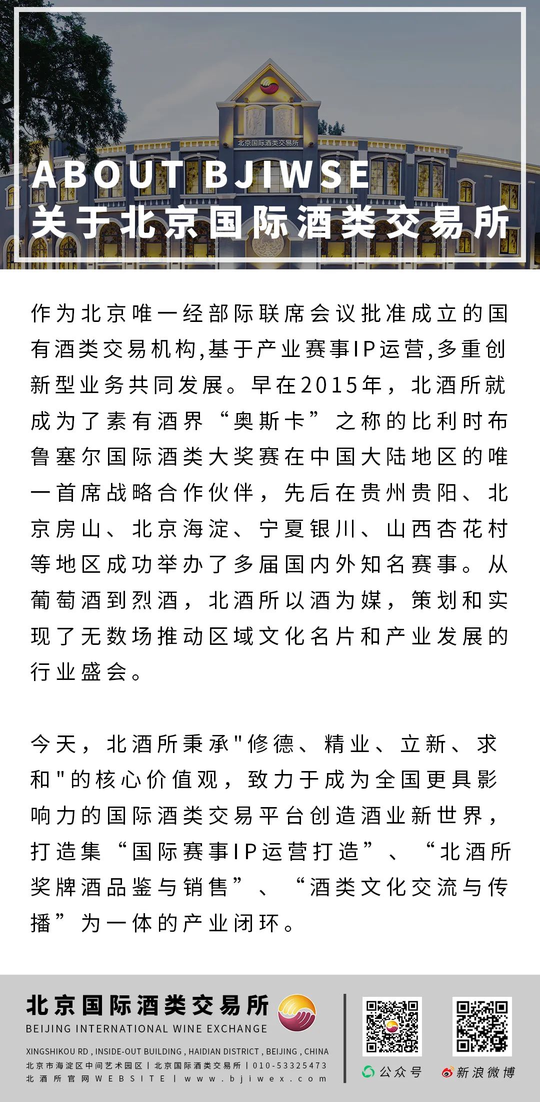作为北京唯一经部际联席会议批准成立的国有酒类交易平台,北京国际酒类交易所经北京市政府批准,于2011年正式成立。依托股东北京一轻控股有限责任公司和中粮长城酒业有限公司,以及深厚的国际赛事组织经验,北酒所对酒类产品的市场属性有着深刻的认知和洞察,并时刻关注酒类行业的发展趋势。