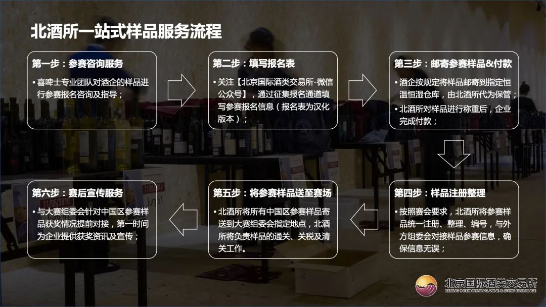 北酒所共计为1300+中国葡萄酒和烈酒企业保持稳定的合作关系。累计为比利时布鲁塞尔国际赛事舞台输送了6000+款参赛样品,致力于打造“中国区赛事样品征集第一服务商”。2023年,北酒所将继续牵手"布鲁塞尔国际啤酒挑战BBC",为中国啤酒厂牌提供一站式参赛样品征集、国际物流及赛后宣传服务。