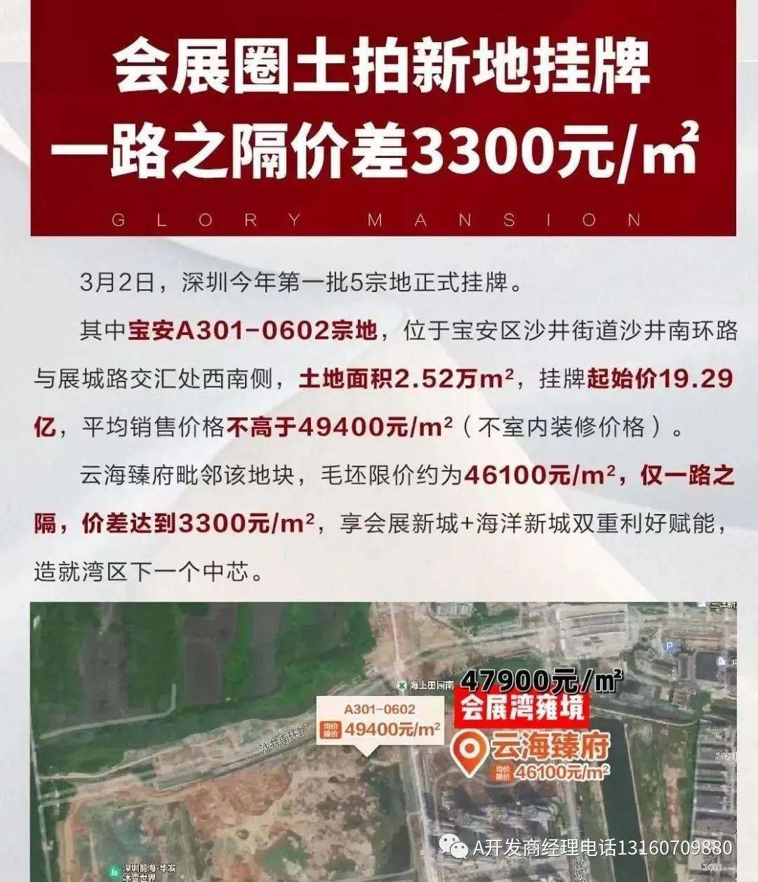 3月2日,深圳今年第一批5宗土地正式挂牌,项目一路之隔的新挂牌土地,毛坯限价4.94万元/m²,与会展湾雍境价差达1500元/m²,与云海臻府价差达3300元/m²,此新地挂牌利好招商会展湾雍境及云海臻府!