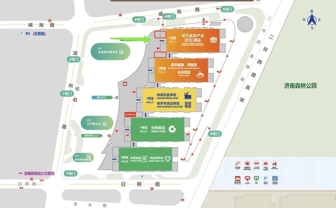 遥墙机场:济南遥墙国际机场站上车机场巴士5号线(始发)→济南东站(换乘地铁R3线)→八涧堡站(换乘地铁R2线)→二环西路站(步行至山东国际会展中心西入口)