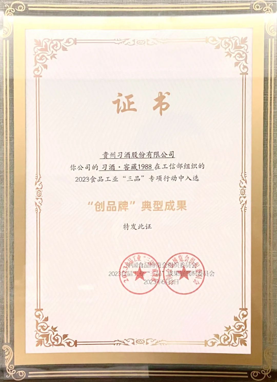 本届展会期间,国家工信部从2020年至2022年间全国1719项“三品”专项行动优秀成果中,遴选了372项食品工业“三品”典型成果展出。习酒核心产品“习酒·窖藏1988”荣获2023食品工业“三品”专项行动“创品牌”典型成果。获奖证书