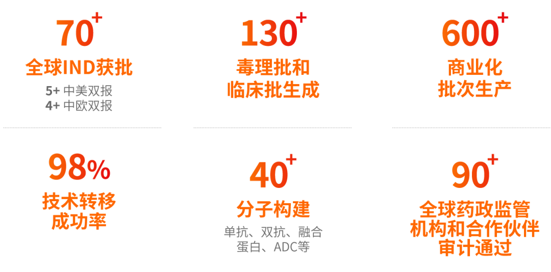 · 服务范围涵盖从细胞株构建至商业化生产的端到端CDMO服务,包括单抗、双抗、融合蛋白、ADC等的开发和生产。