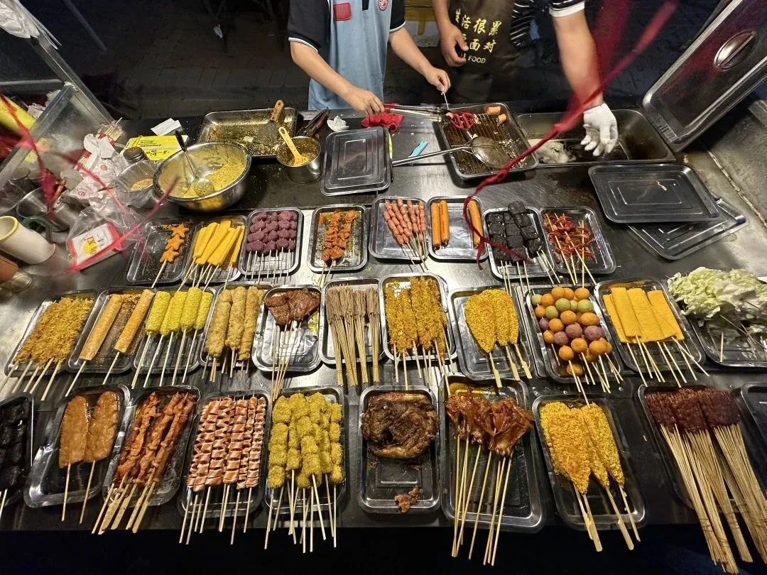 道路两边,是来自各地的美食“大荟萃”,烤鱿鱼、爆米花、棉花糖、糖葫芦、烤面筋......香味四处弥漫,满满的烟火气,引来大批游客前来购买。