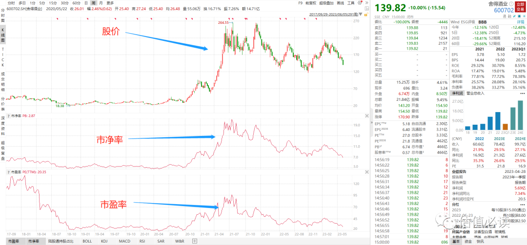 截至2023/6/5,舍得酒业市盈率TTM27,市净率6.74。