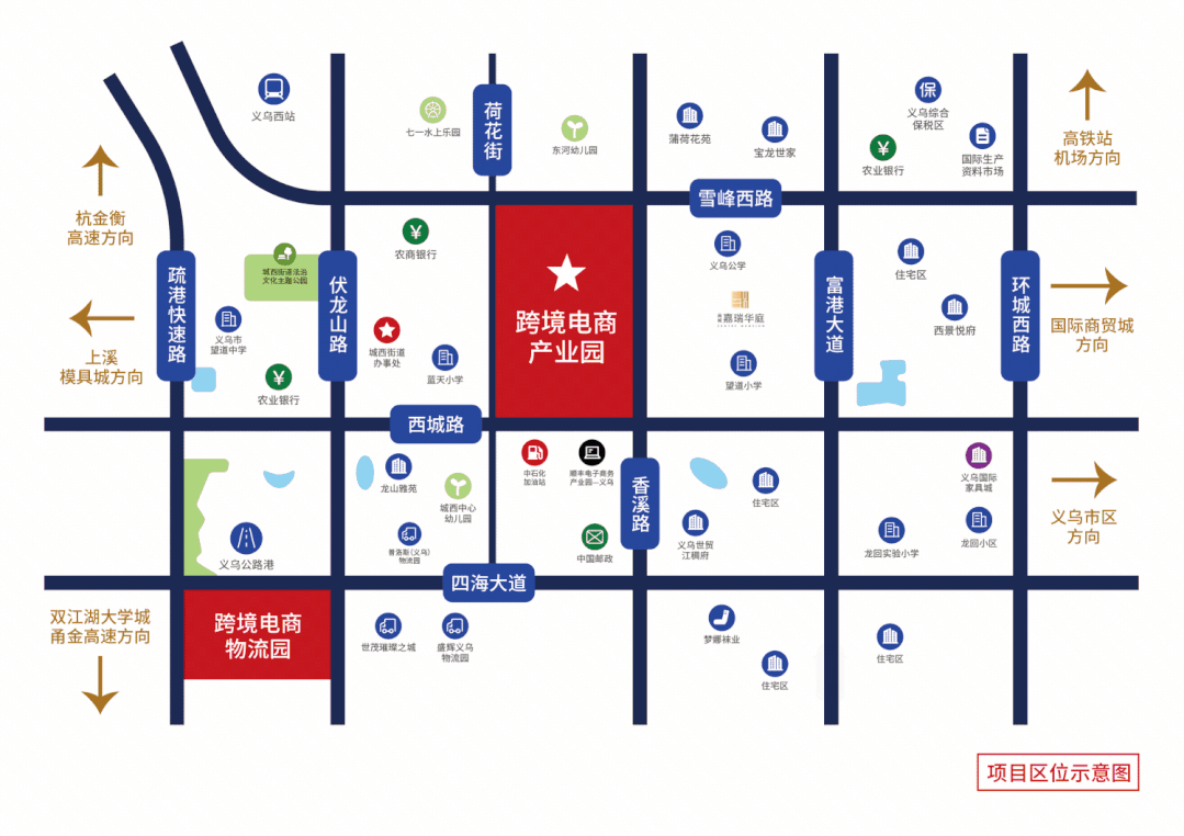 项目位于义乌自贸区的核心区块;背靠义乌综保区,南接物流云驿小镇,紧邻城西产业功能区;距离义乌市中心、国际商贸城、高铁站、义乌机场均在10-20分钟车程。