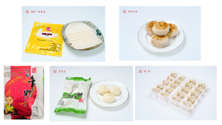 速冻米面:年糕片、火锅年糕、鲜肉月饼、烤鸭饼、八宝饭、春卷、荠菜笋丁包、青菜香菇包、猪油豆沙包、三丁包等