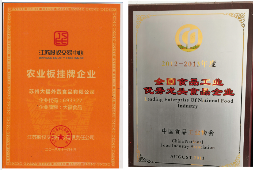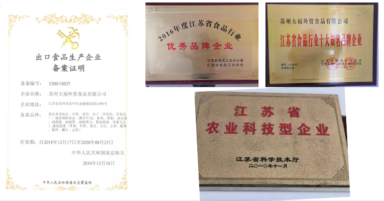 全国食品工业优秀龙头食品企业、江苏省食品行业优秀品牌企业、江苏省农业科技型企业、苏州市级农业龙头企业、苏州市出口名牌企业和名牌产品、全国农业食品电商技术装备优秀供应商,是江苏省首批农产品加工挂牌企业(江苏股权交易中心)
