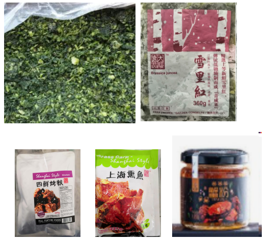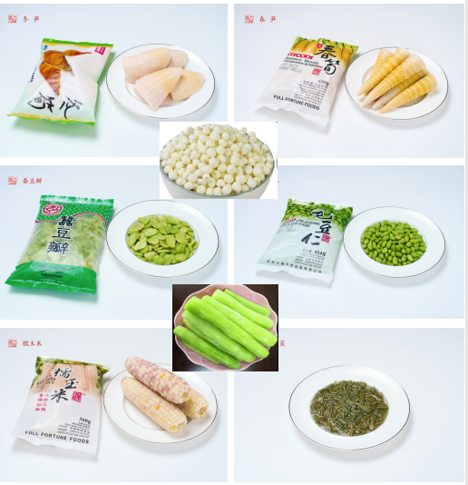 速冻果蔬:荠菜馅、马兰头、春笋、冬笋、莴笋、山药、冬瓜、油炸茄子、蚕豆、毛豆仁、太湖莼菜、苏州鸡头米、藕片、马蹄、银杏仁、板栗仁、青刀豆、西山桃仁等