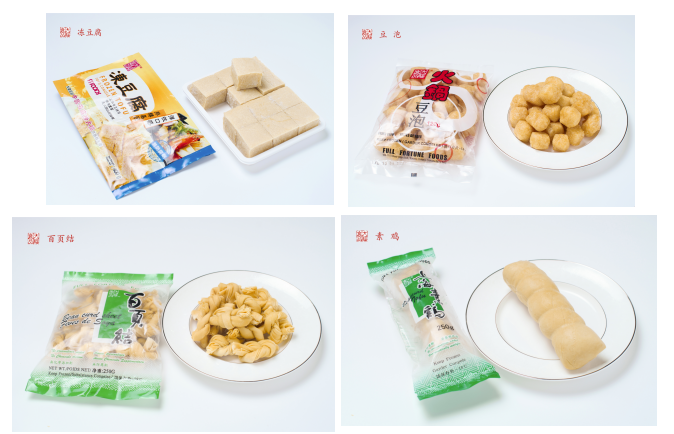 速冻豆制品:油面筋、百叶结、薄百叶、油炸素鸡片、烤麸、火锅豆泡等