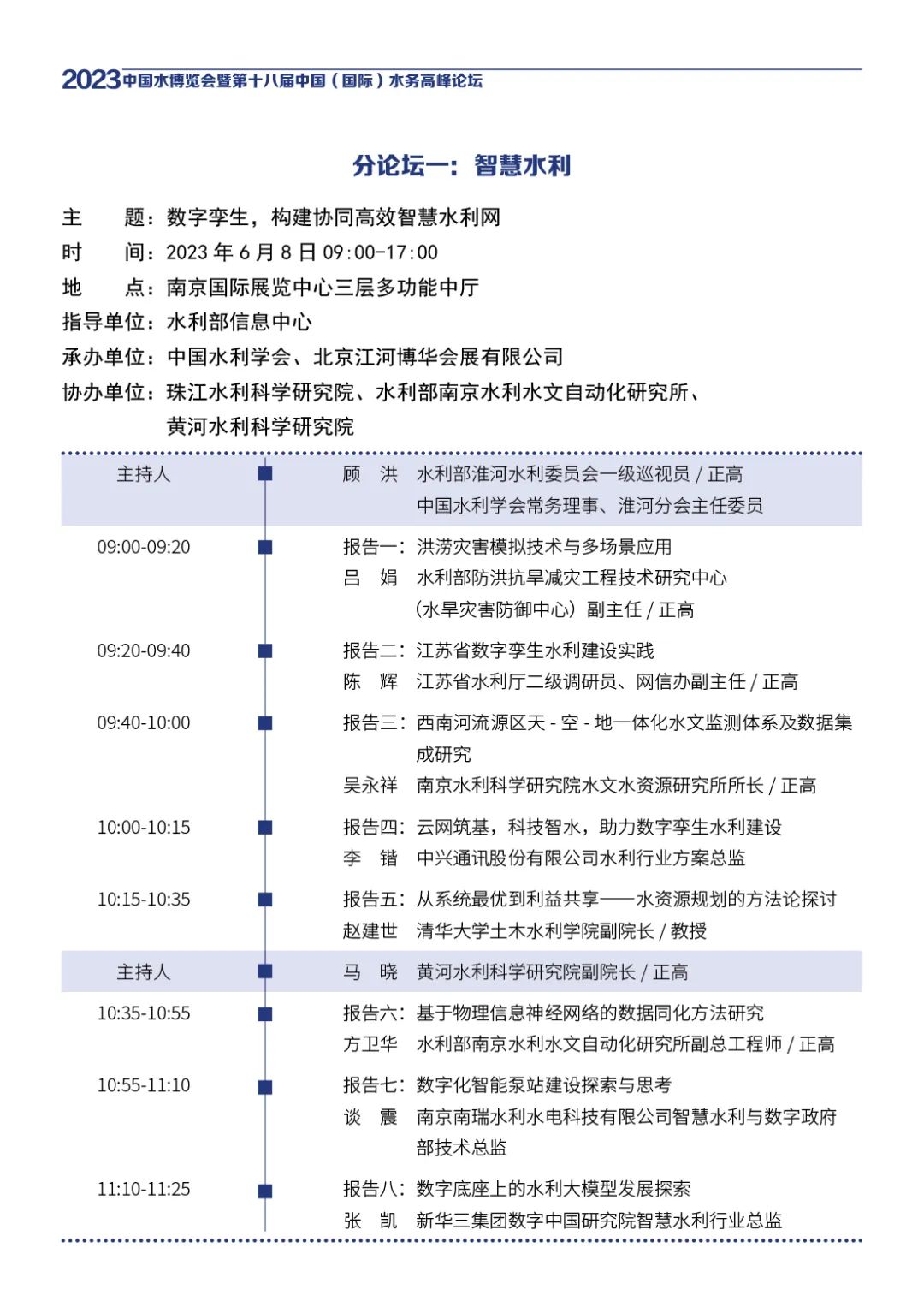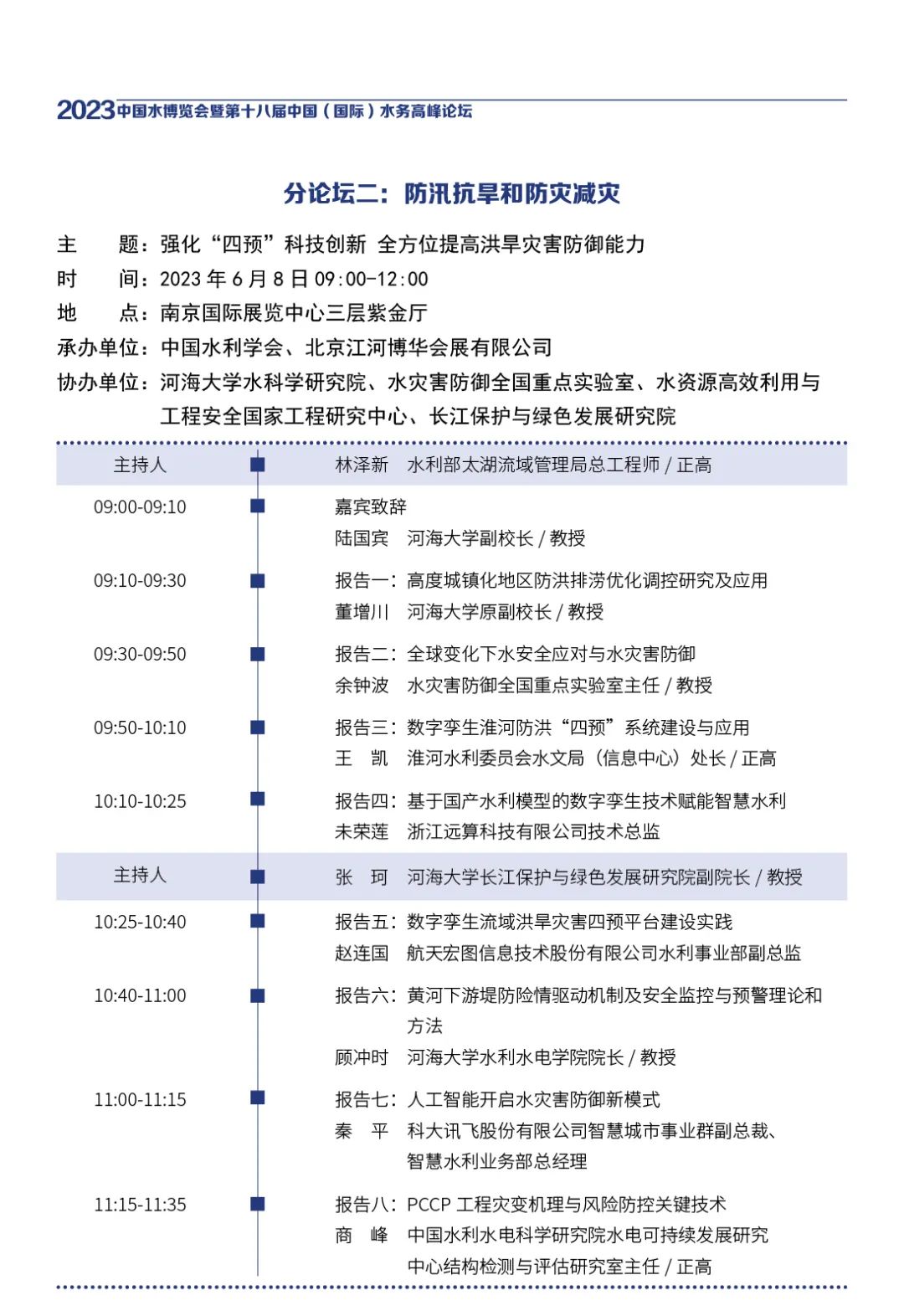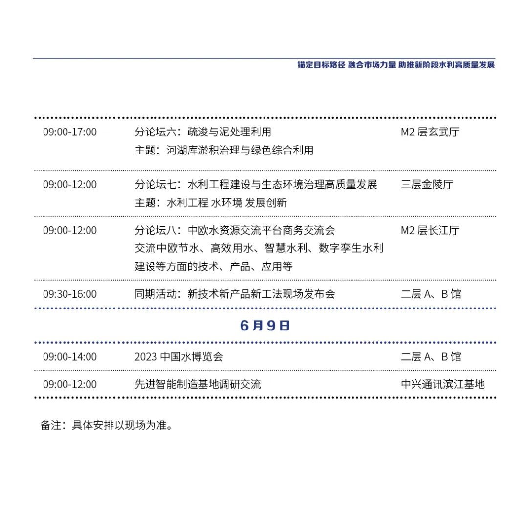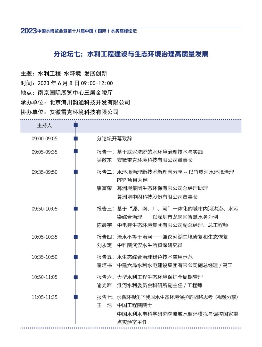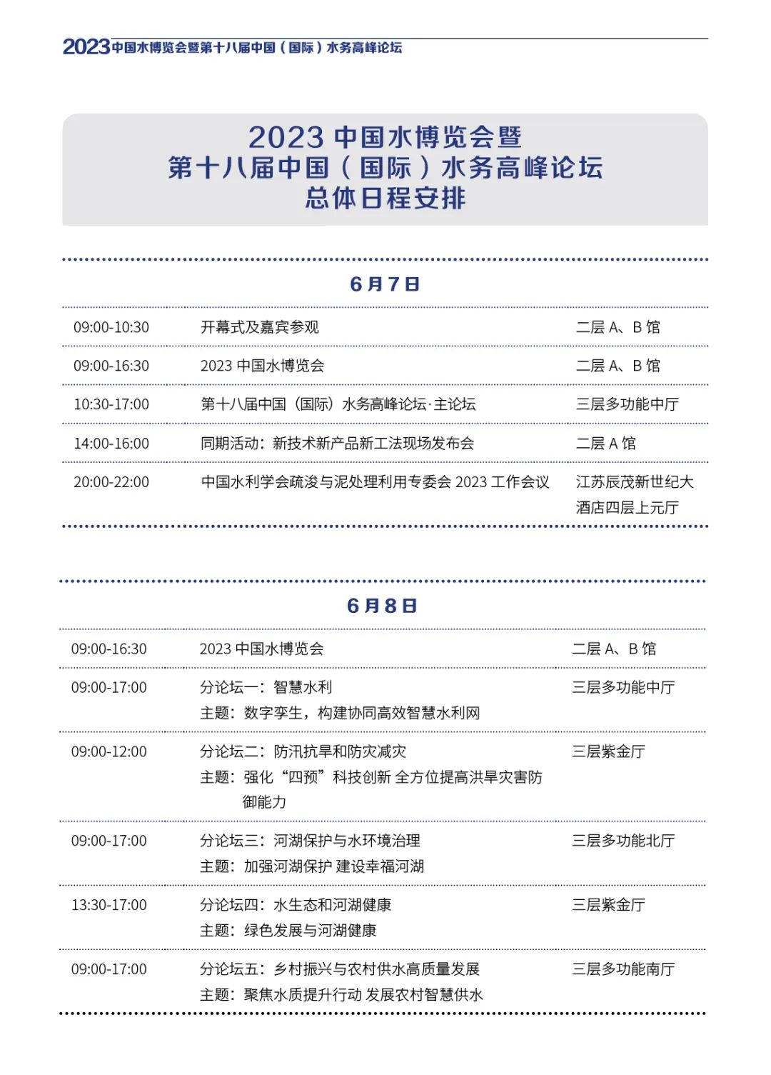 6月7日-9日,“2023中国水博览会暨第十八届中国(国际)水务高峰论坛”将在南京旅游集团国展中心举办,本届水博会致力于涉水新产品、新技术、新材料、新工艺,以及新理念、新政策、新方案、新经验的推广宣传和交流融合,是水利行业内集“政、产、学、研、用”为一体的重要综合服务和交流平台。本届水博会将设置如下展览专区:水利工程建设管理与运行管理、水利工程机械设备及技术、智慧水利、水生态治理与保护、农村供水引水与饮水安全、农田灌溉、节水型社会建设、水旱灾害防御、城市水务等。本届水博会期间还将组织丰富的配套活动,将举办新技术新产品新工法现场发布及普及推广会、创新应用案例应用场景发布会、团体标准发布会、涉水科研机构与企业技术服务需求对接会、现场签约、典型水利工程调研交流等。