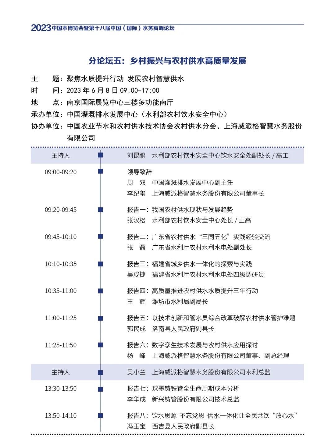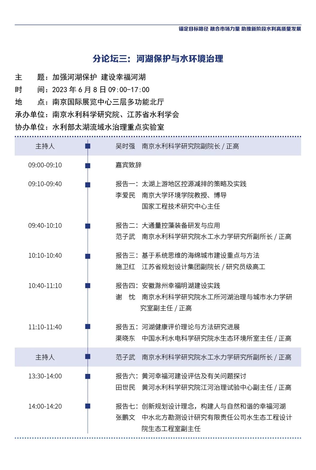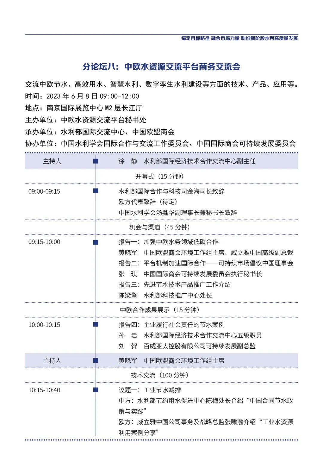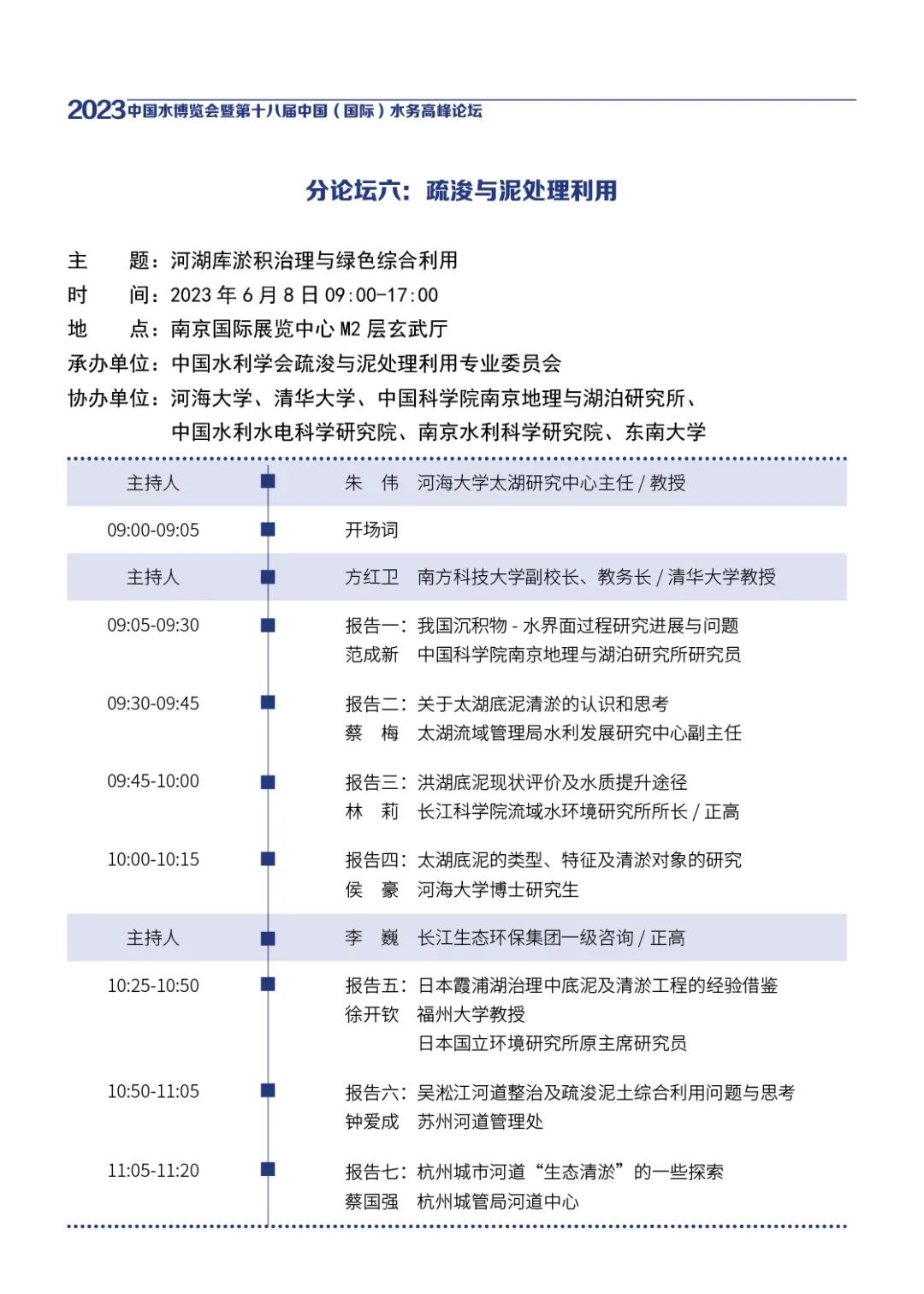 6月7日-9日,“2023中国水博览会暨第十八届中国(国际)水务高峰论坛”将在南京旅游集团国展中心举办,本届水博会致力于涉水新产品、新技术、新材料、新工艺,以及新理念、新政策、新方案、新经验的推广宣传和交流融合,是水利行业内集“政、产、学、研、用”为一体的重要综合服务和交流平台。本届水博会将设置如下展览专区:水利工程建设管理与运行管理、水利工程机械设备及技术、智慧水利、水生态治理与保护、农村供水引水与饮水安全、农田灌溉、节水型社会建设、水旱灾害防御、城市水务等。本届水博会期间还将组织丰富的配套活动,将举办新技术新产品新工法现场发布及普及推广会、创新应用案例应用场景发布会、团体标准发布会、涉水科研机构与企业技术服务需求对接会、现场签约、典型水利工程调研交流等。