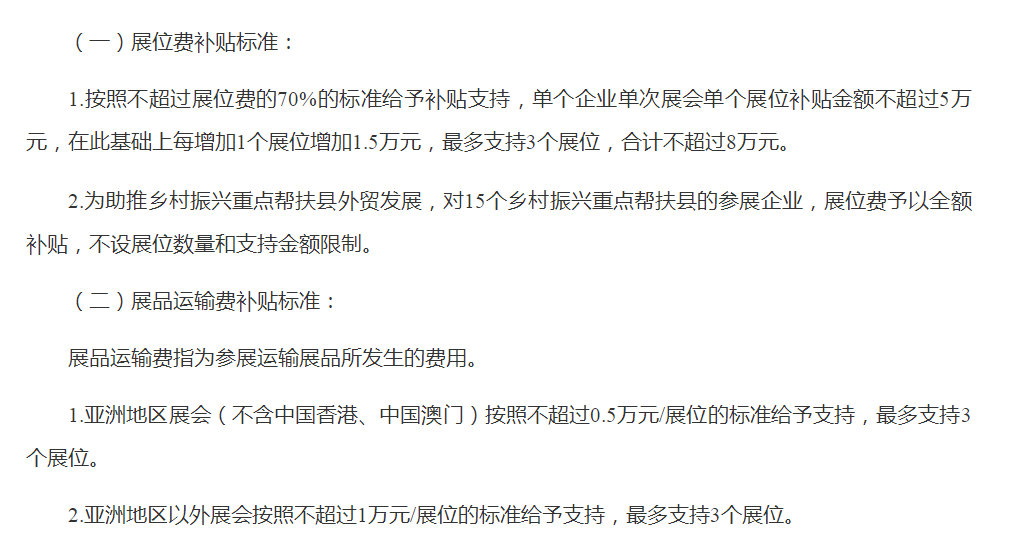 2.亚洲地区以外展会按照不超过1万元/展位的标准给予支持,最多支持3个展位。