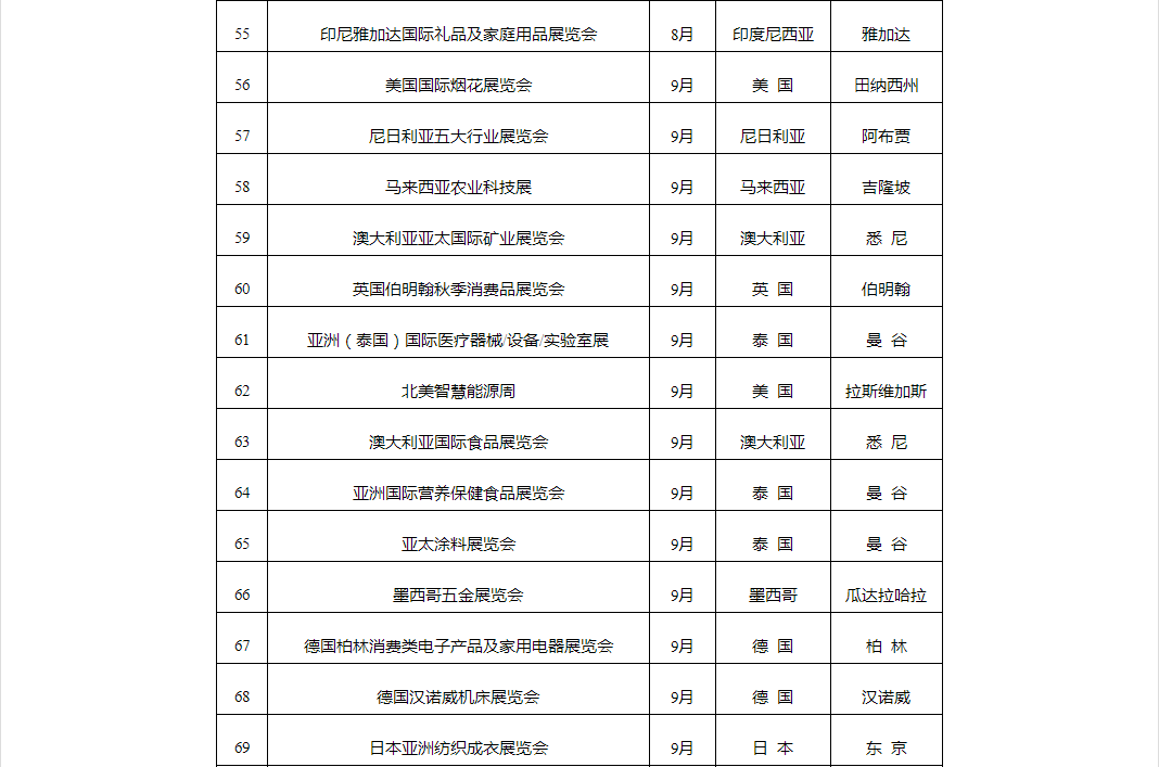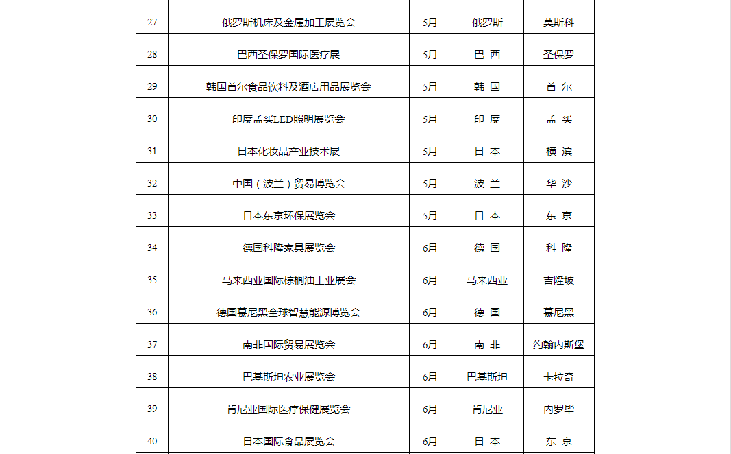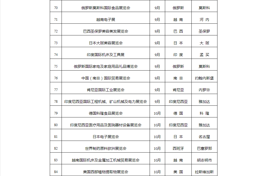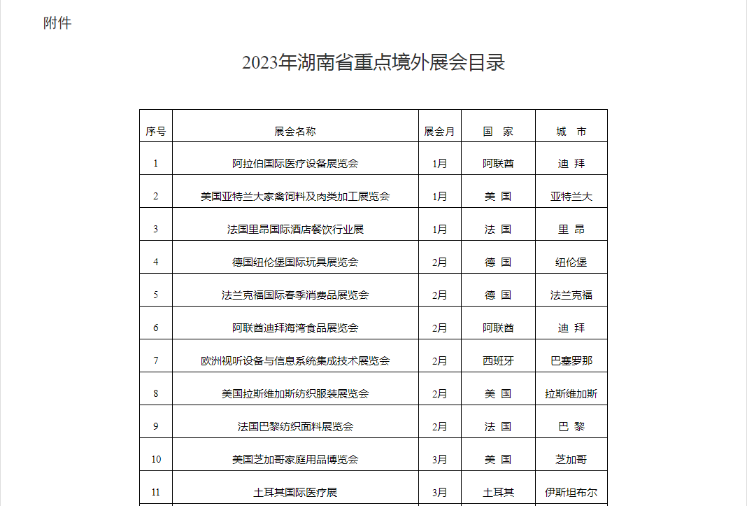 近日,湖南省商务厅、湖南省财政厅、中国国际贸易促进委员会湖南省分会发布《2023年湖南省重点境外展会目录》(以下简称《目录》),并在发布该《目录》的《通知》中明确:对以实地参展、代参展的形式(不含线上参展)参加《目录》内106场展会的省内企业,将参照展位费补贴、展品运输费补贴、人员费补贴、展位数量换算等4项标准,给予适当支持。
