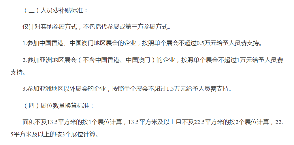 3.参加亚洲地区以外展会的企业,按照单个展会不超过1.5万元给予人员费支持。