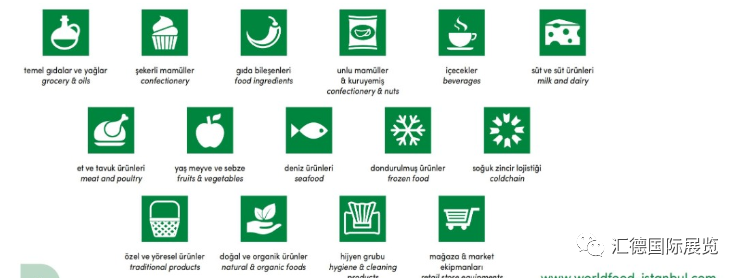 食品果蔬类:新鲜水果与蔬菜、冷冻水果和蔬菜、脱水果蔬、烘干水果与坚果农副类: 牛奶与乳制品 肉类产品 动物产品 冷冻海产品 面条谷类加工食品 各种面食及意大利面 豆类食品 蔬菜油 精制食品与即食食品 橄榄 橄榄油 罐装及听装食品休闲类食品: 面点与烘烤食品、糕点糖果 巧克力 饼干 果酱、蜂蜜、糖浆及蜜糖制品食品添加剂: 食品原料 香辛料 佐料 调味酱及调料饮料及其他: 非酒精饮料,茶和咖啡,(新鲜食品的)低温运输系统,食品处理和物流