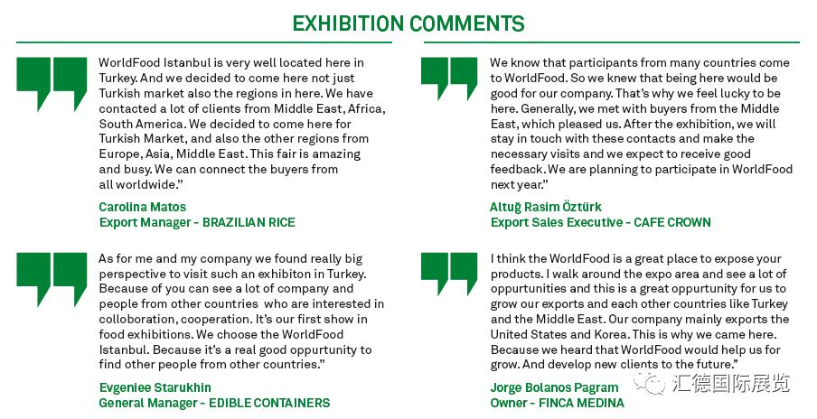 展会名称:2023年土耳其食品展览会(World Food Istanbul)土耳其伊斯坦布尔国际食品展览会被称为土耳其的“食品品牌项目”,已经成功举办了29届,是全球食品行业领导人最关注的食品行业专业展览会之一,为各大食品品牌提供了新品牌和技术创新的契机。同时,该展在土耳其当地具有极高的战略性地位,促进了外贸的巨大潜力。该展专业程度高,展品分类齐全,涵盖范围广。展会期间,当地相关协会、商务机构、行业学会、以及土耳其外贸管理署还通过组织特别的“买家见面会”以及“国际买商目标计划”环节,为国际展商带来了更有效的买方观众。该展会展出面积为26162平方米,预计有来自全球25个国家的835家食品及食品加工企业参加该展会,并有专业约163个国家的38358名采购商亲临现场,其中约有12633名来自土耳其以外的其他国家。参展商总体量排名前五的国家分别是:土耳其、俄罗斯、印度、中国、埃及。食品批发商、分销商、零售商