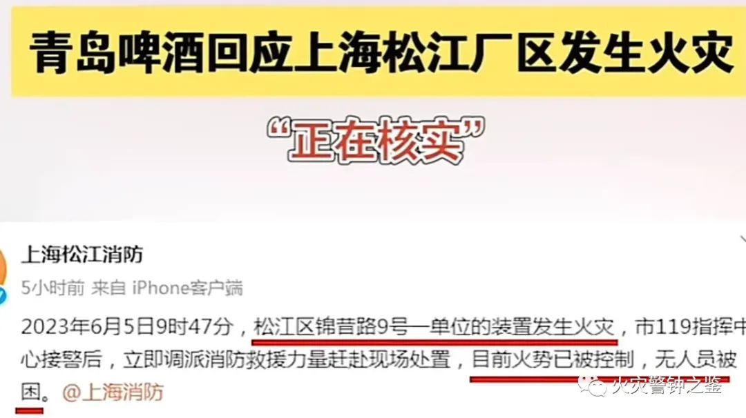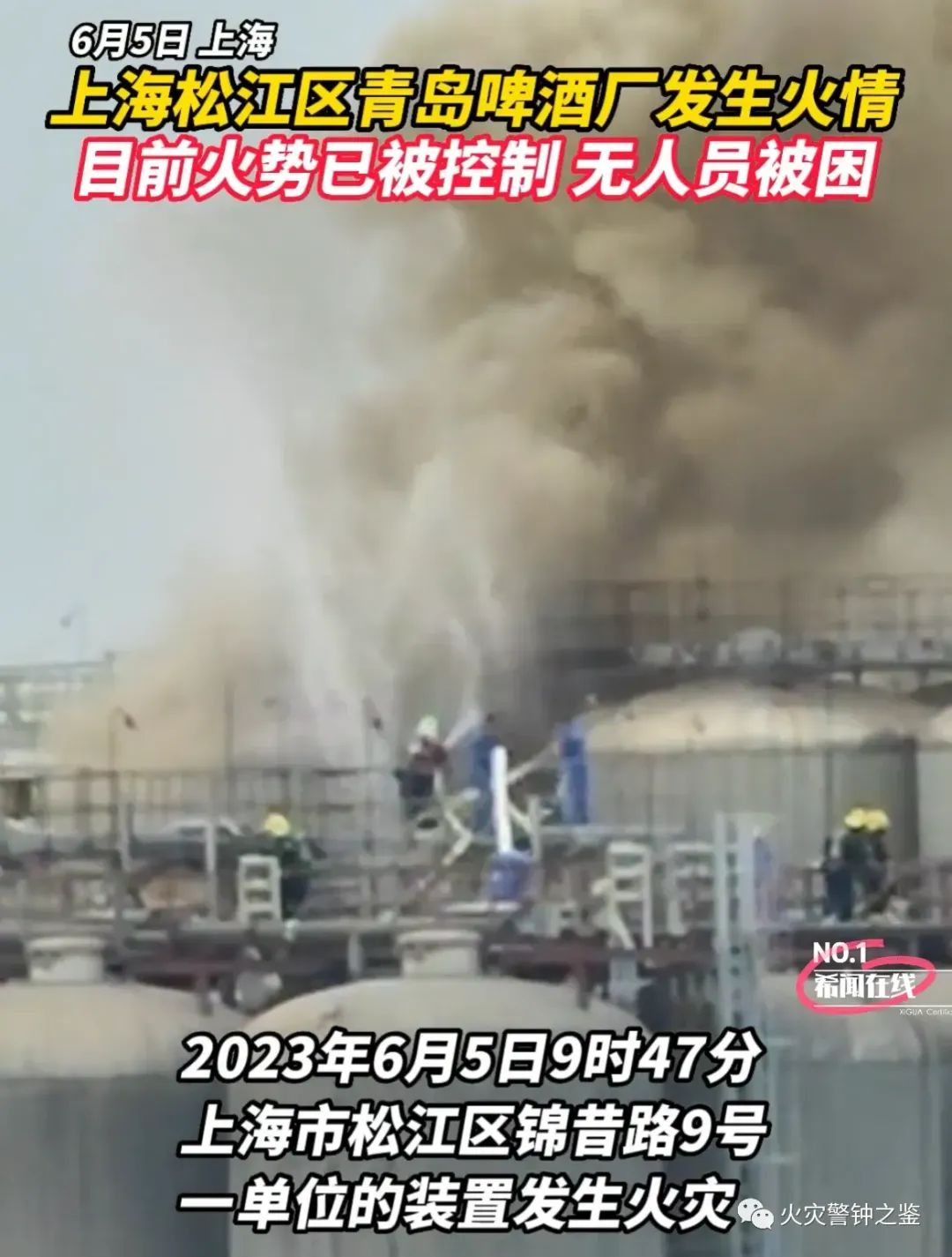 2023年6月5日9时47分,位于上海市松江区锦昔路9号的青岛啤酒厂发生火灾,浓烟滚滚,黄色浓烟升空。从网传视频看,现场浓烟滚滚,渐成黄色浓烟升空,消防人员站在罐体上进行救援。通常来讲,黄绿色烟是有毒的,有化学物质燃烧产生,需要认真对待。青岛啤酒回应,上海松江厂区发生火灾“正在核实。”