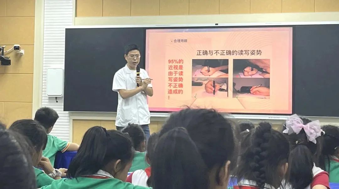 俞医师从国内青少年近视现状、近视形成过程和近视危害三个方面向同学们作了深入浅出的讲析,结合医学专业知识和现实中素材给学生呈现了一堂生动直观的教育课。教学中,他还为学生提供了一些科学用眼、防控近视、营养健康等方面的合理化意见和措施,教会学生端正写字姿势、适度运动、防范与处理校园眼外伤的基本技能,同学们细心听讲,收获颇丰。