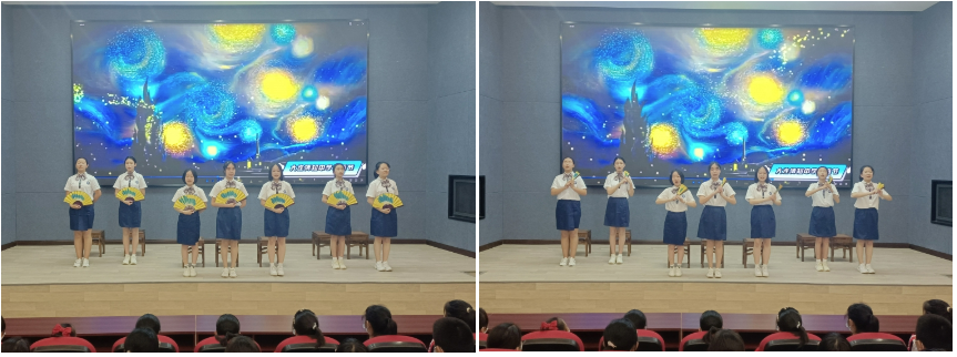 七年二班,诗朗诵《读中国、满江红》,慷慨激越,带着历史的悲壮,勇毅的奋进,震古烁今。