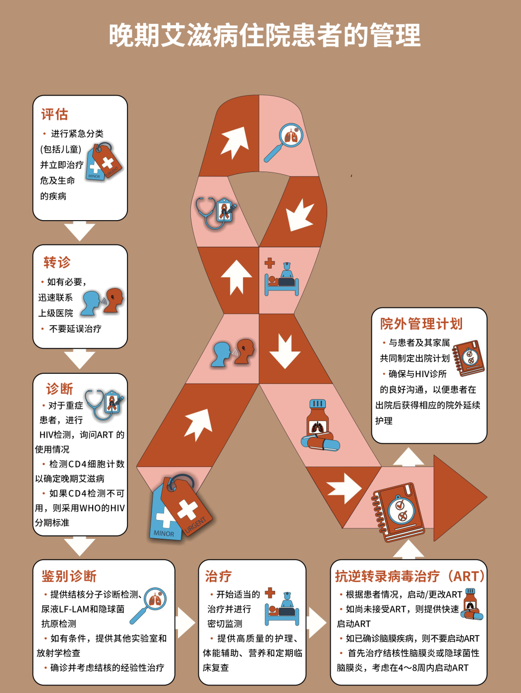 虽然规范的抗逆转录病毒治疗(ART)使很多HIV感染者获得生存获益,但是对于晚期患者来说,其出现病情恶化和死亡的风险仍然很高。晚期艾滋病与多种因素相关,比如治疗费用增加、机会性感染风险增加、免疫重建炎症综合征、免疫重建不完全等。受多重感染、院外配套护理措施不健全、患者自理能力受限等影响,晚期患者住院治疗的结局也不甚理想。