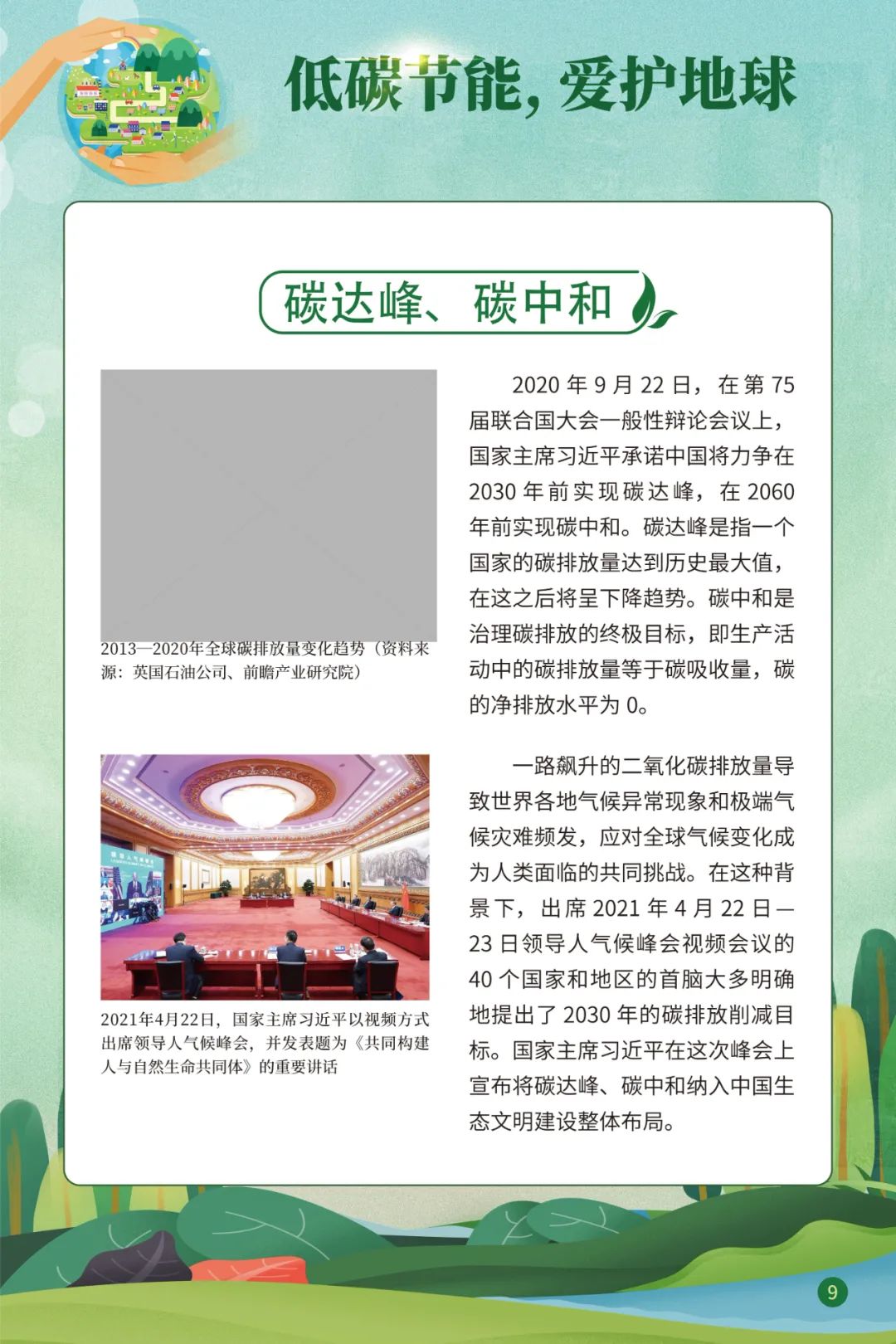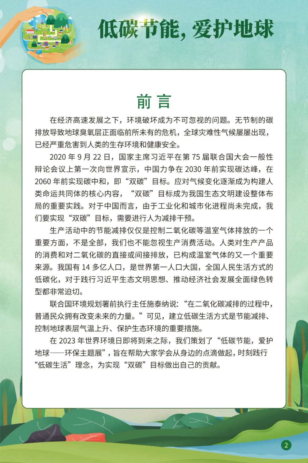 在经济高速发展之下,环境破坏成为不可忽视的问题。无节制的碳排放导致地球臭氧层正面临前所未有的危机,全球灾难性气候屡屡出现,已经严重危害到人类的生存环境和健康安全。作为负责任的大国,中国已经明确提出“力争在2030年前实现碳达峰,2060年前实现碳中和”的目标。然而所谓“碳达峰”“碳中和”究竟是什么?它们又与我们的生活有何关系?世界环境日到来,我们策划了“低碳节能,爱护地球——环保主题展”,旨在帮助大家学会从身边的点滴做起,时刻践行“低碳生活”理念,为实现“双碳”目标做出自己的贡献。