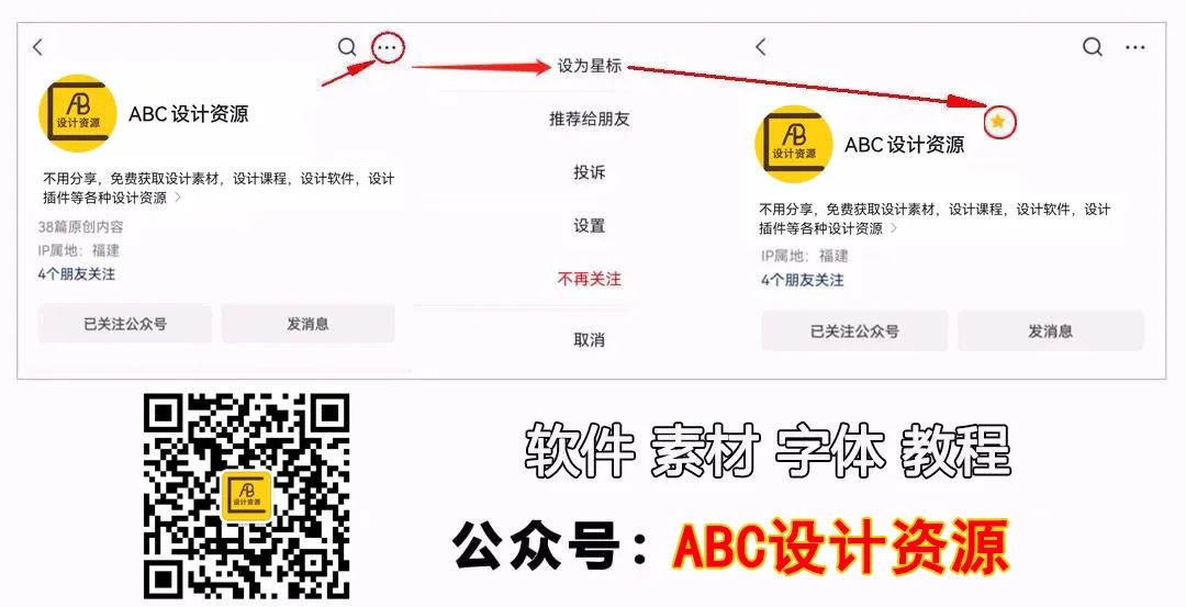 专注分享 - 设计素材、设计软件 设计插件、设计教程 还未星标置顶公众号的朋友,记得星标置顶一下,方法是点击公众号的界面然后右上角的三个点第一个就是添加星标(最新腾讯机制,如果几天不观看,系统就不会推送)时间长了就不会给您推送我的文章了,以防错过精品资源,感谢大家的支持与厚爱。 长按二维码进入 ABC设计资源 点击右上角