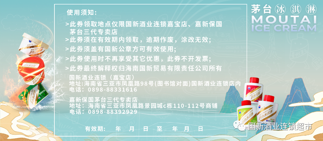 国新酒业连锁为各分店准备了“茅台冰淇淋领取券”,在门店购买“领取券”,就可以到 嘉新保国茅台三代专卖店、国新酒业连锁(嘉宝店)、兑换对应口味的冰淇淋!让你的味蕾沉浸在无尽的美味之中。
