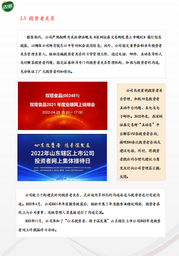 《双塔食品:2022年度环境、社会及治理(ESG)报告》共计33页,主要内容分为公司信息、公司治理、可持续运营和绿色发展、消费者权益保护、社会责任五个部分。