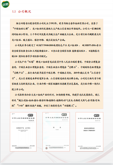 烟台双塔食品股份有限公司成立于1992年,前身为烟台金华粉丝有限公司,坐落于“中国粉丝之都”、龙口粉丝的发源地与主产地山东省烟台市招远市.是目前行业内规模最大的龙口粉丝、豌豆蛋白、膳食纤维、豌豆淀粉生产企业。公司是行业内首个国家级重点高新技术企业,行业内唯一国家级循环经济教育示范基地,是行业内唯一境内A股上市公司。