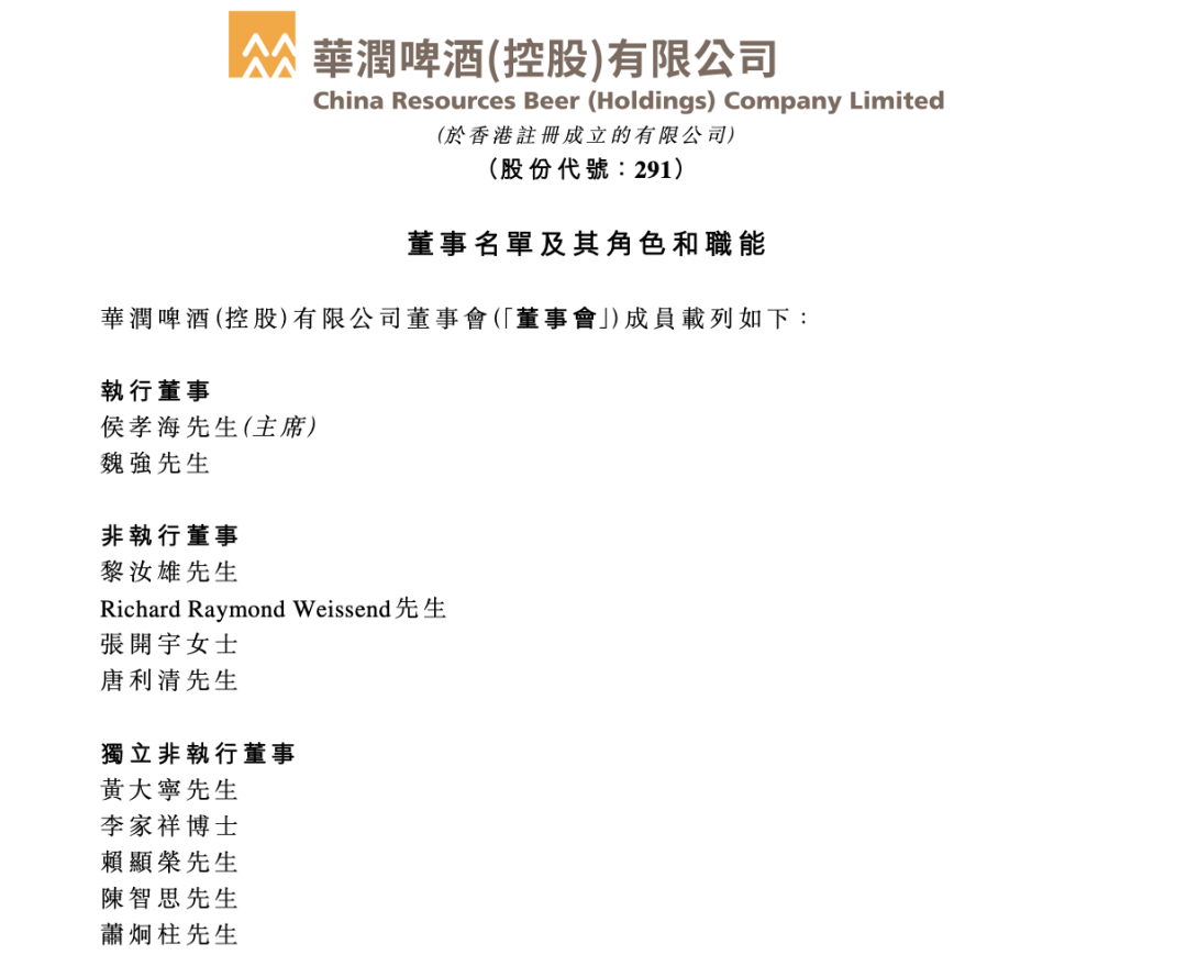 此外,华润啤酒的CEO职务目前也暂时处于空缺状态,目前是由公司前CEO侯孝海暂时承担相应的职责,侯孝海已经于2023年4月20日从CEO职务调任为董事会主席。