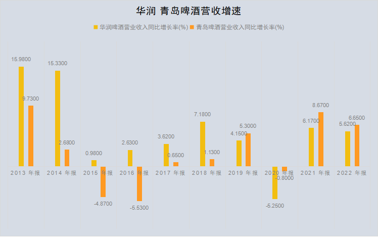 一季度头部啤酒股价表现最差的是重庆啤酒,原因是一季度重啤高端系列的收入下滑了3.3%,而低端啤酒的收入增长了11.37%,这也就意味着高端的价格已经涨不动了。其实啤酒行业的增量,从2014年以后就已经结束了,头部厂商靠着并购以及全国化仍能维持缓慢增长,但营收增速也一直在10%以内。比如销量第一的华润啤酒,2014年之后的年营收增速一直在8%以内,青岛啤酒的情况更糟糕一些,2014年后连续四年的增速低于2%。