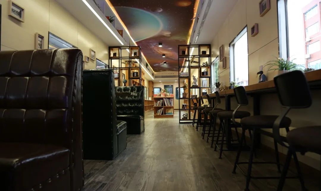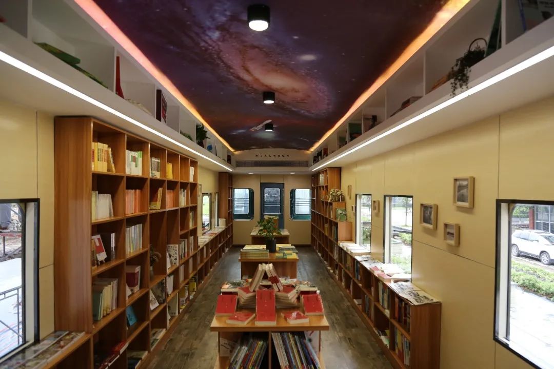 课程设置在独秀书房·桂航火车号,车厢掩映在绿树丛中,车厢外的公共空间被设计成火车站台,车内顶部装饰了奇幻的太空图景,舒适的桌椅和沉浸式的复古阅读空间为课程体验加分。