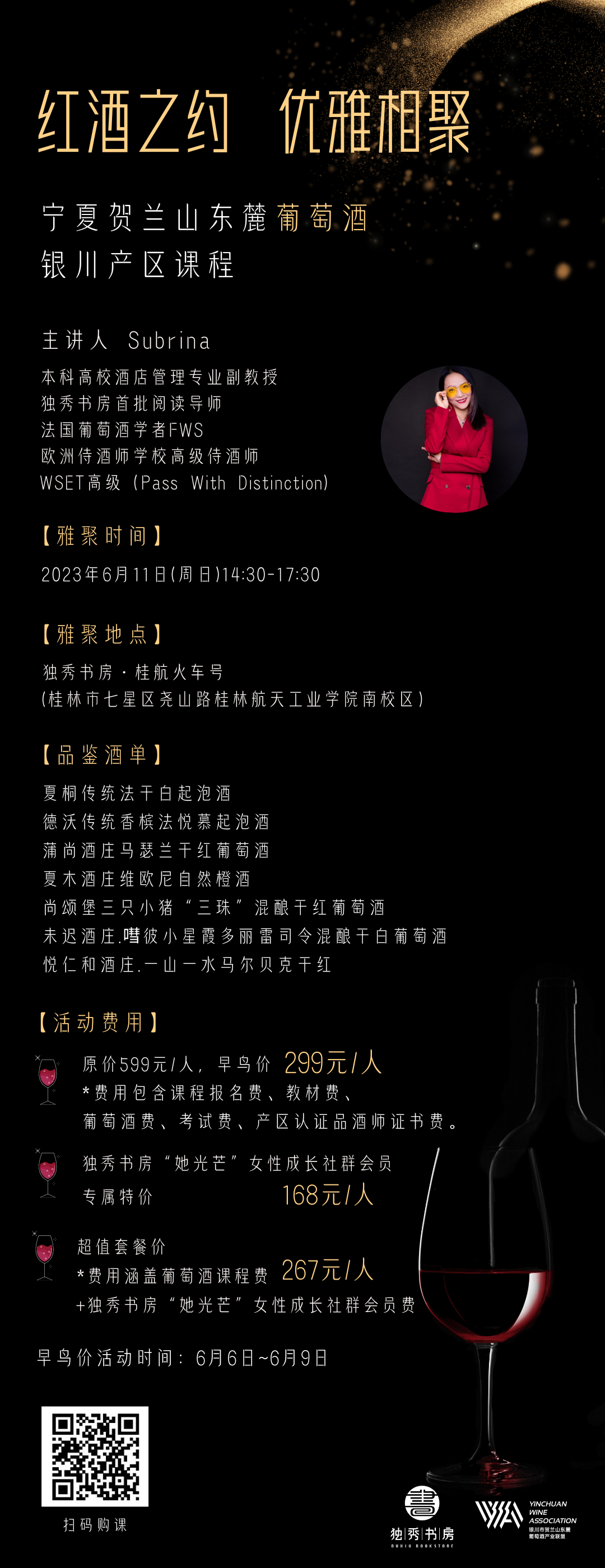 6月11日14:30,本科高校酒店管理专业教师、副教授,法国葡萄酒学者FWS(Pass With Distinction),Subrina将在独秀书房·桂航火车号带来好评无数的宁夏贺兰山东麓葡萄酒银川产区课程。