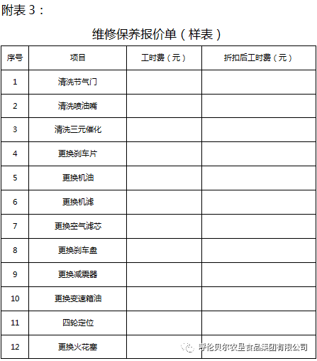 (五)车辆维修业务项目服务费报价表。按照我单位提供明细按车型单独报价(详见附表3、附表4。服务项目包括但不限于表中内容),单项报价按折扣后价报。