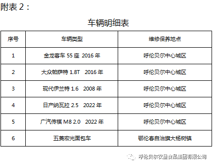 (五)服务内容:呼伦贝尔农垦食品集团有限公司车辆维修、维护保养,包括车辆大修、中小修、专项修理以及维护保养等,具体车型详见附表2。