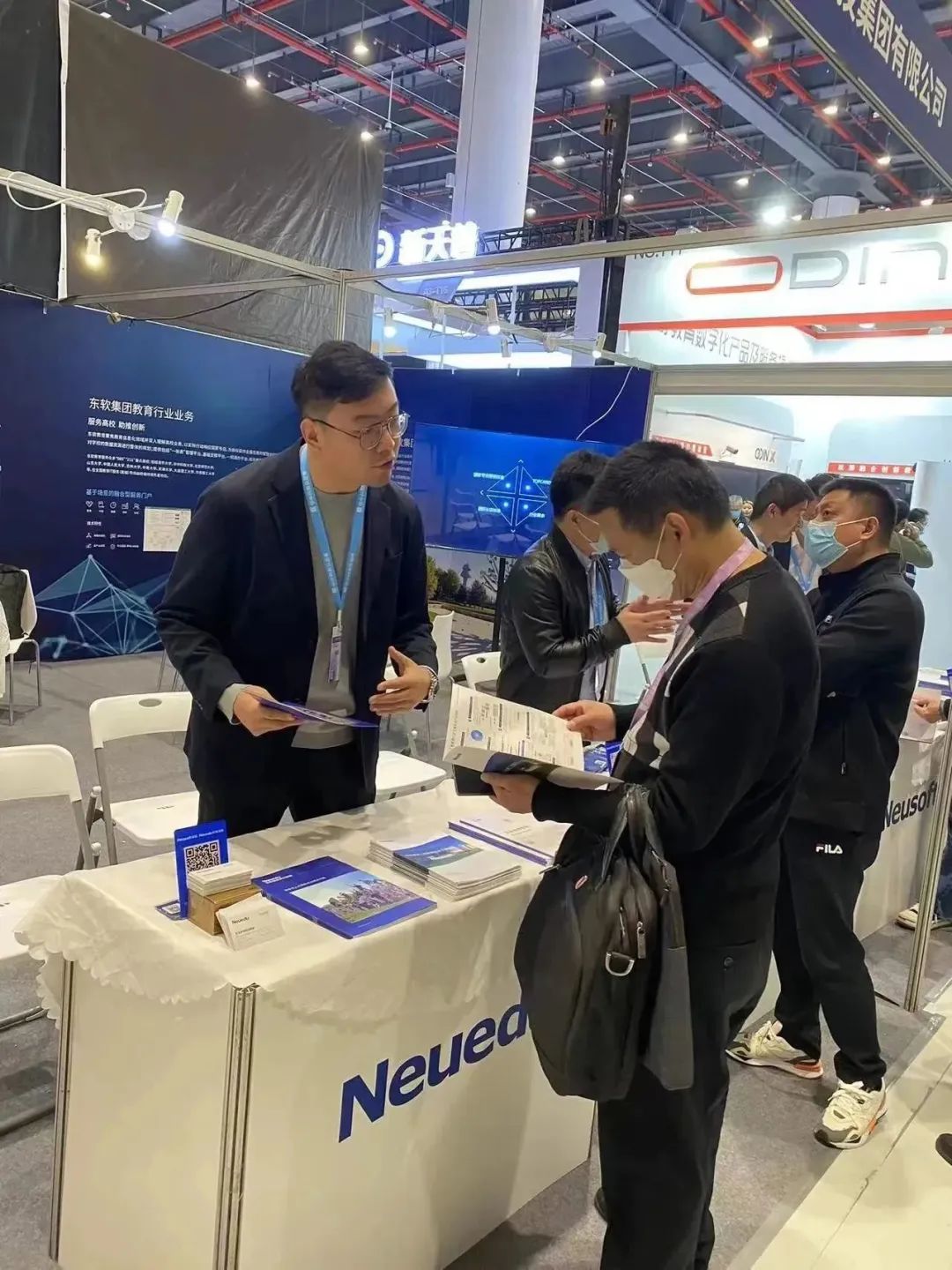 东软教育展位位于展示教育技术装备及智慧校园展馆,展位吸引了众多高校领导与参会嘉宾驻足咨询和交流。东软教育依托东软雄厚的产业优势与学历教育丰厚的办学积淀,打造了一套完整的校企协同育人模式,本次展览会全面展示产业学院与专业共建、智慧教育平台与教学内容、智慧实训室、数字工场等一系列解决方案,为参观者带来全新体验。